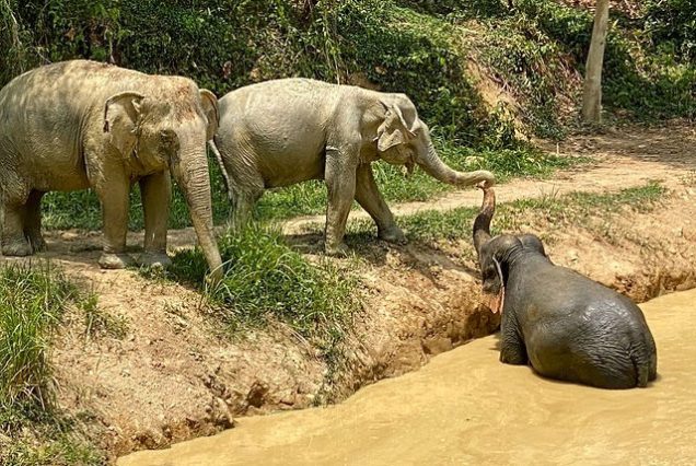 Elephants need space to splash, roll around, submerge, play, socialise, and cover themselves in mud and they are perfectly capable of doing this without people in the water or mud crowding around them. It is not only dangerous but also very stressful for the elephants as it inhibits their natural behaviours and the mahouts must control the elephants so nobody gets hurt. It is also unhygienic to bathe with elephants as they urinate and defecate when in the water, and people may suffer from eye or skin infections and sickness.